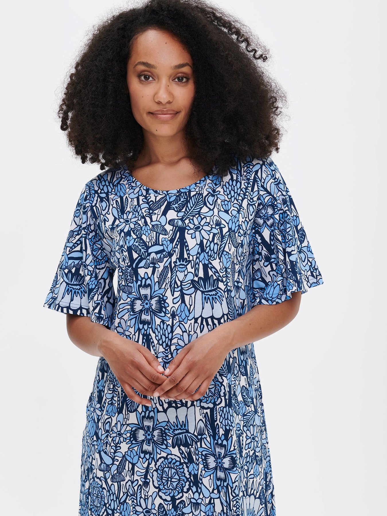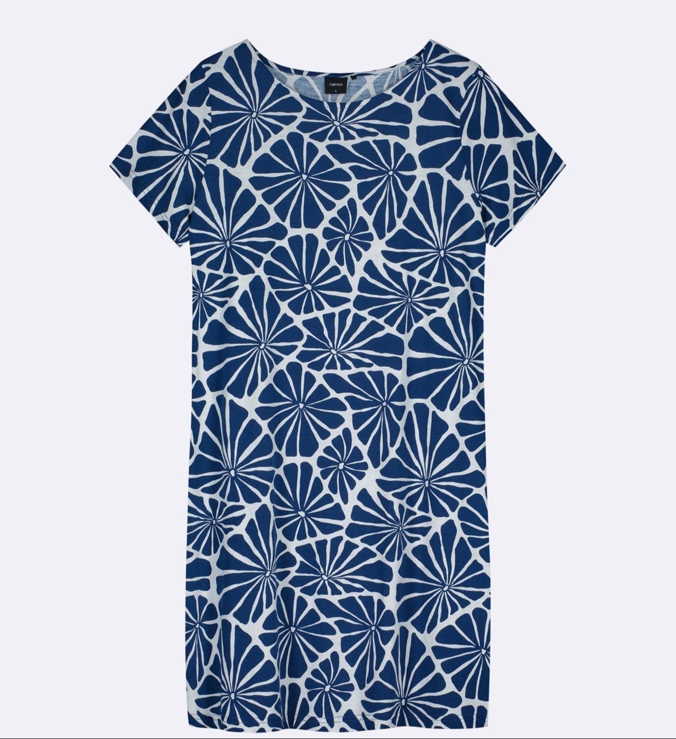 Women’s dark blue patterned Aralia short nightgown with short sleeves and an oval neckline. The length of the shirt in size M is about 95 cm. The material is high-quality cotton and modal, which is easy to care for, feels pleasantly soft against the skin and holds its shape well, wash after wash. Perfect for a comfortable and stylish night's sleep, offering a relaxed fit and cozy feel for your evening at home.